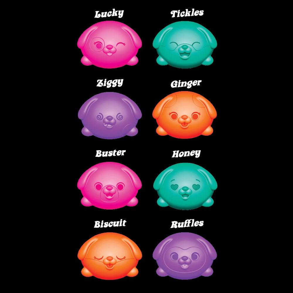 Pups are available in 4 colours (teal, purple, pink, orange) and 8 facial expressions. Pups are packed randomly.