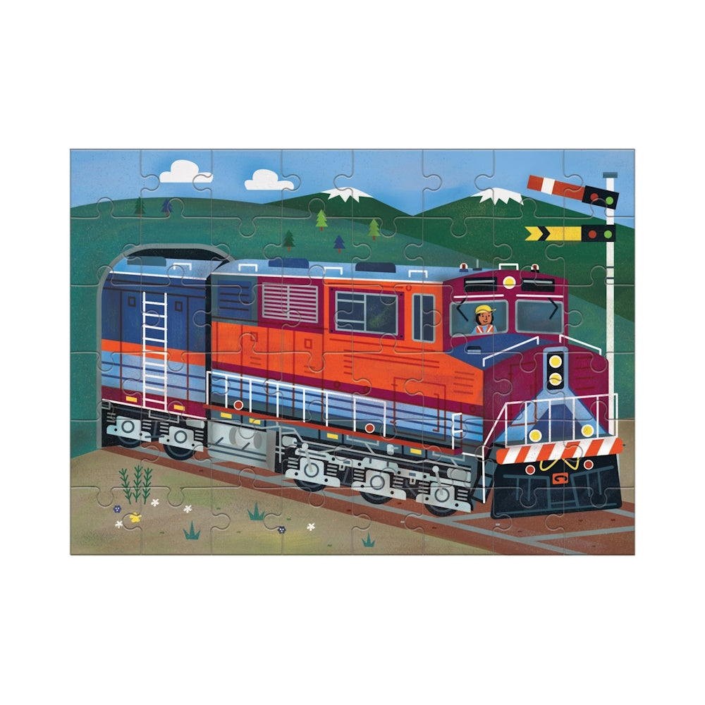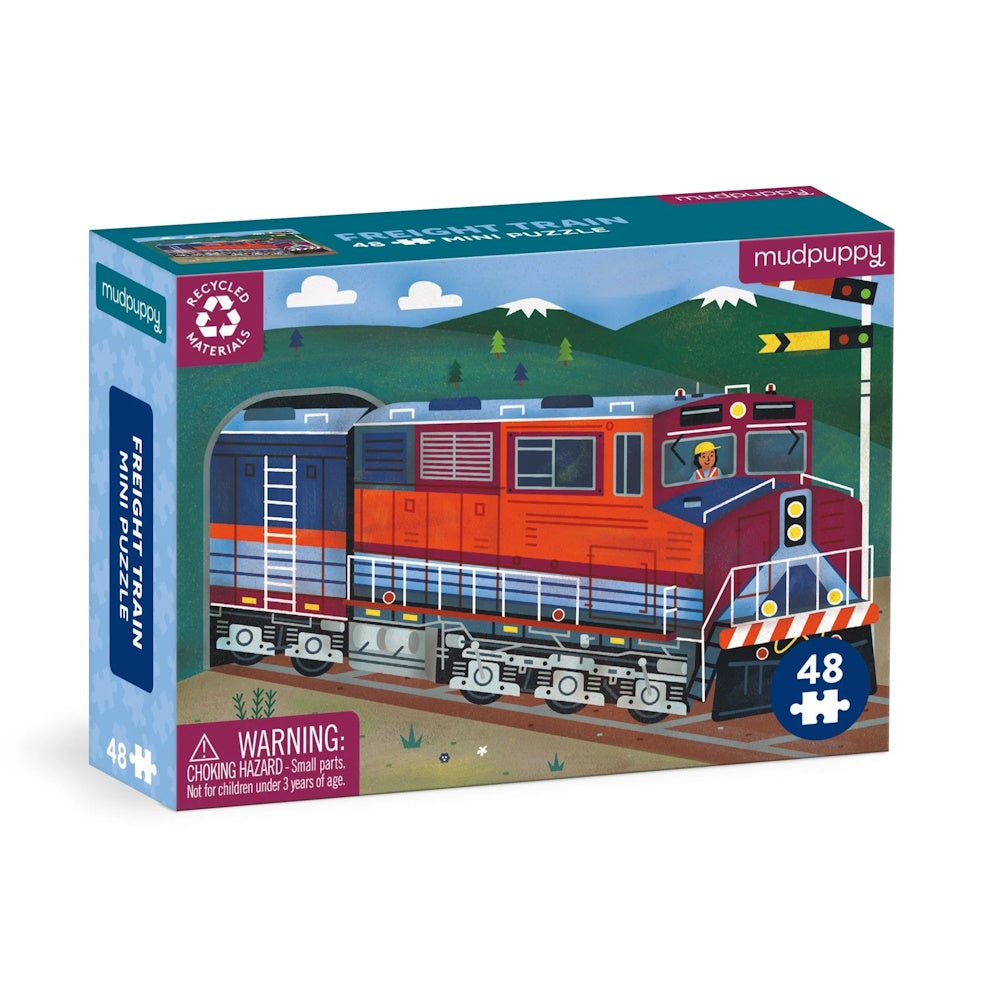 The Freight Train 48-piece Mini Puzzle from Mudpuppy features a colourful image of a freight train emerging from a tunnel.