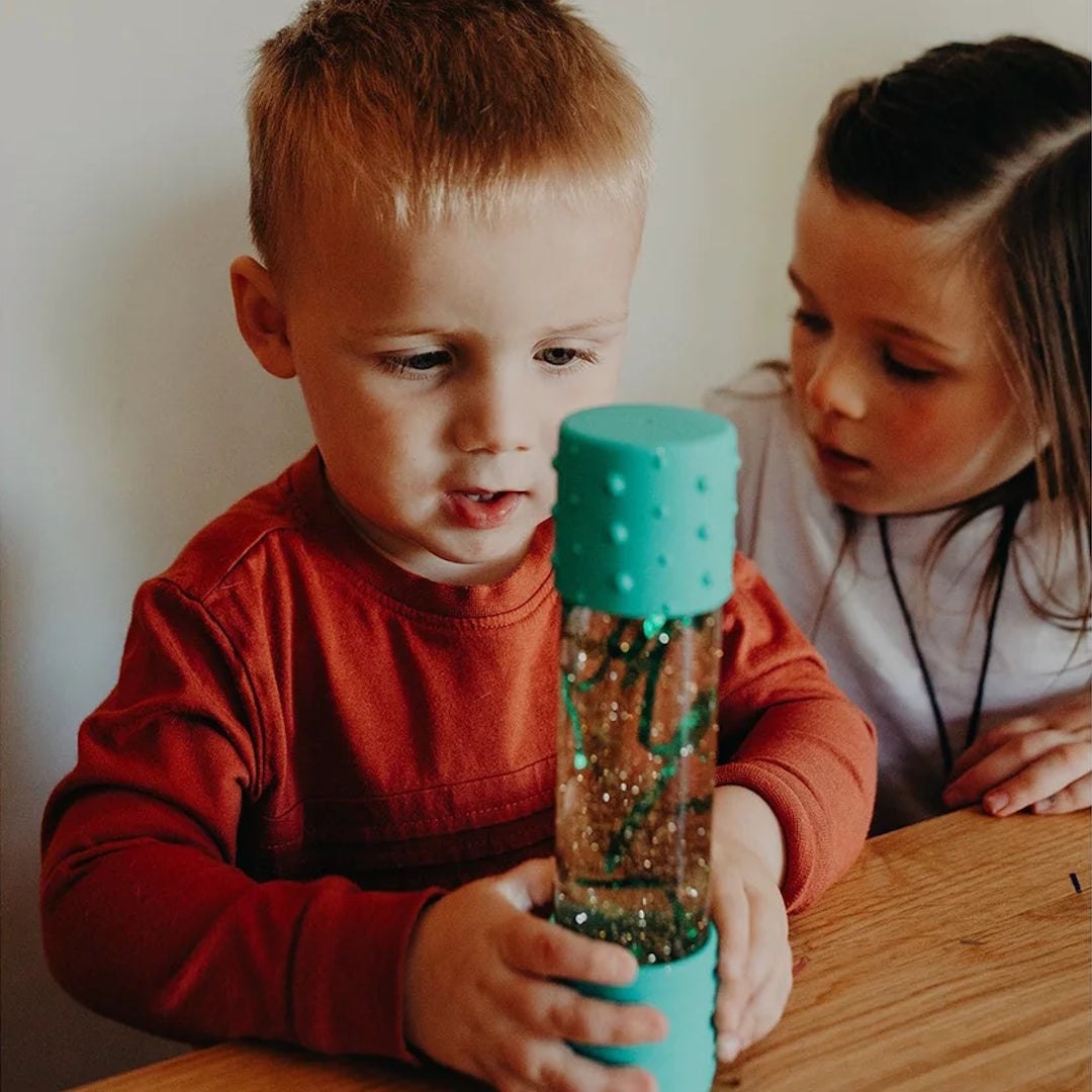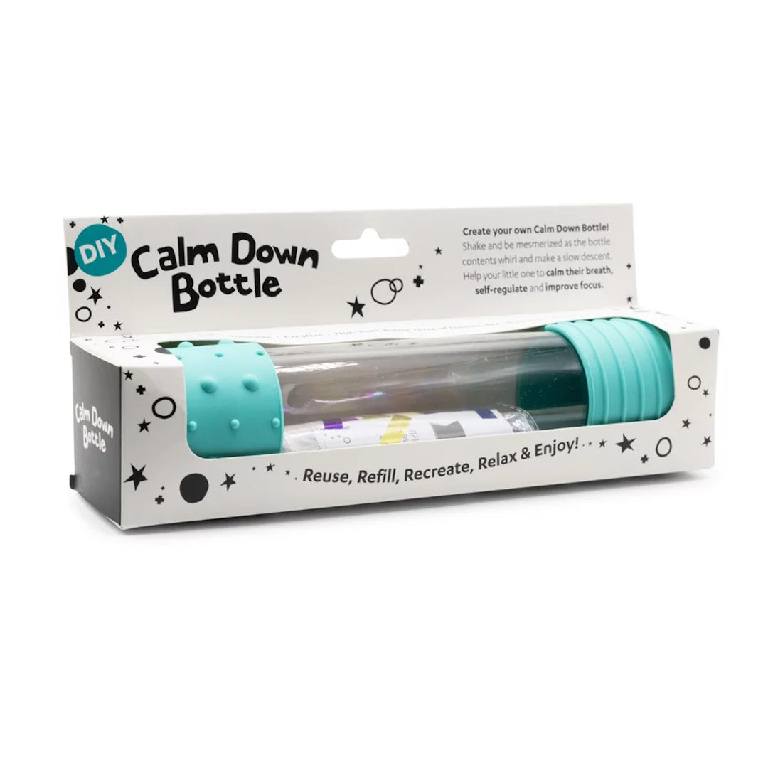 The DIY Calm Down Bottle is designed for focused, calm play. It is used by parents, teachers, and therapists to help children self-regulate their breathing and bring back attention as they focus on the swirling contents. From watching the sparkly magic to exploring the different textures on the silicone caps, it's a hands-on journey that calms busy minds and creates a little slice of calm.