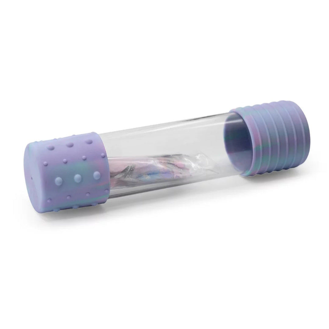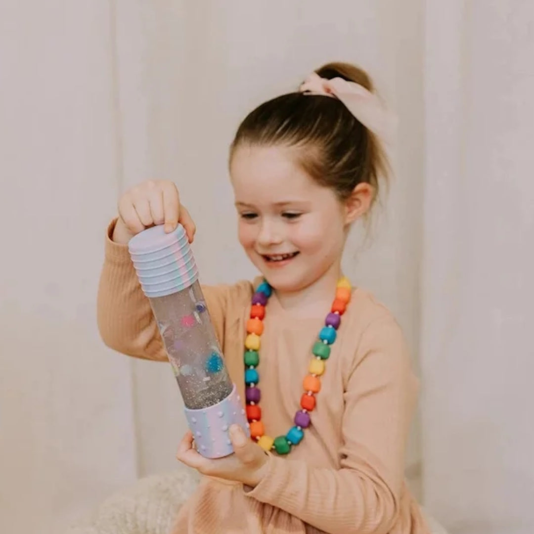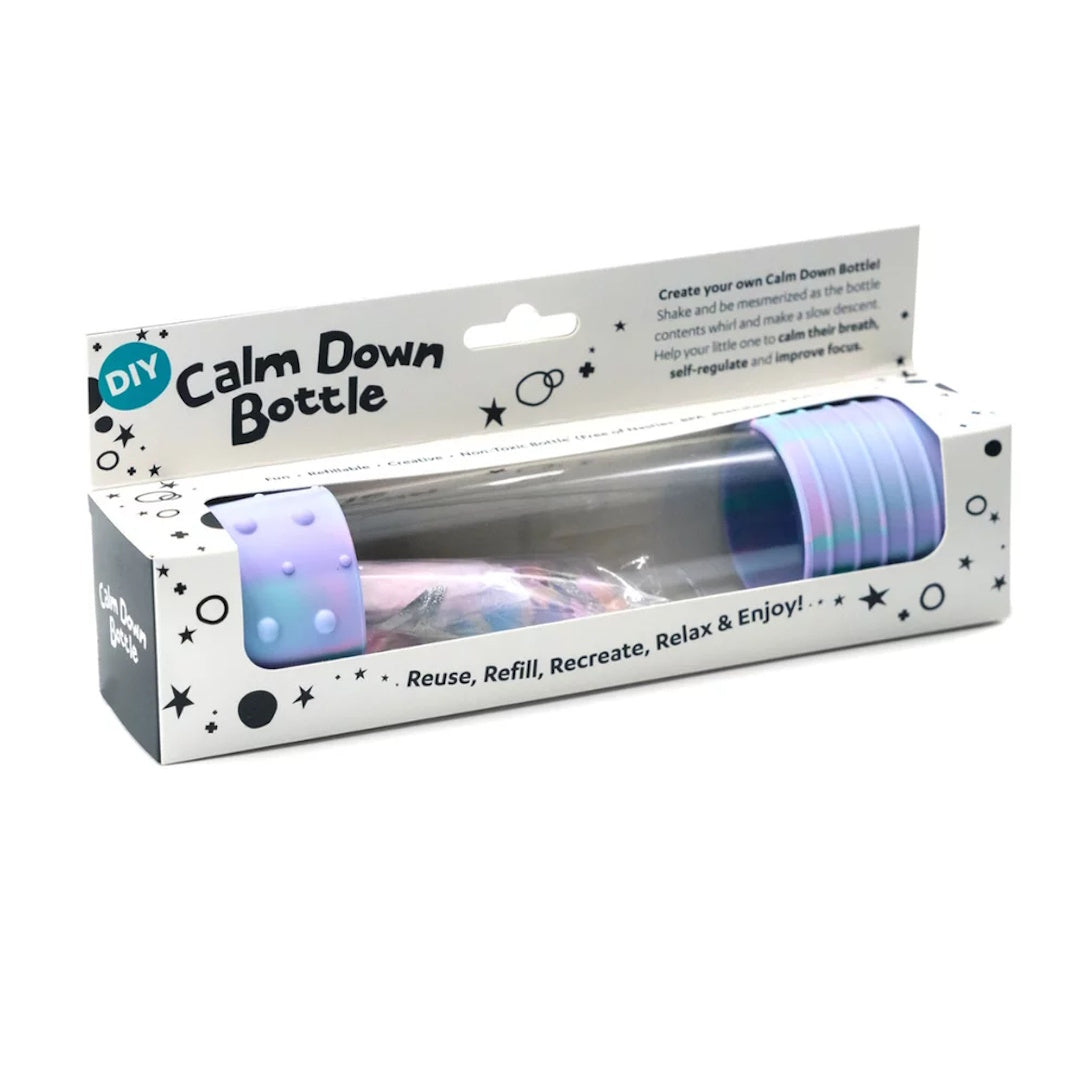 The DIY Calm Down Bottle is designed for focused, calm play. It is used by parents, teachers, and therapists to help children self-regulate their breathing and bring back attention as they focus on the swirling contents. From watching the sparkly magic to exploring the different textures on the silicone caps, it's a hands-on journey that calms busy minds and creates a little slice of calm.