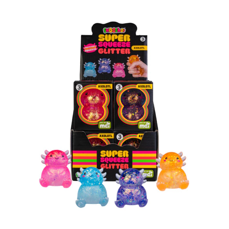 These adorable axolotls are bursting with glittery squish! Smoosho’s Super Squeeze Glitter Axolotl features a soft, satisfyingly squeezable texture that’s perfect for fidgeting, relaxing, and sensory play.
